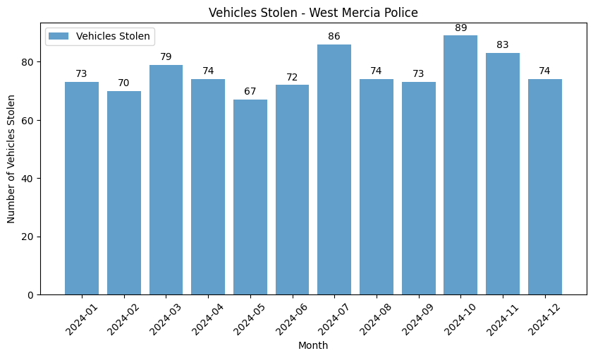- Please could you review the data as it pertains to stolen/recovered cars in 2024. According to the DVLA they received notification of 385 car recoveries, your data indicates W Mercia police recovered 131 cars less, a total of 254 i.e. a recovery rate of just 26%