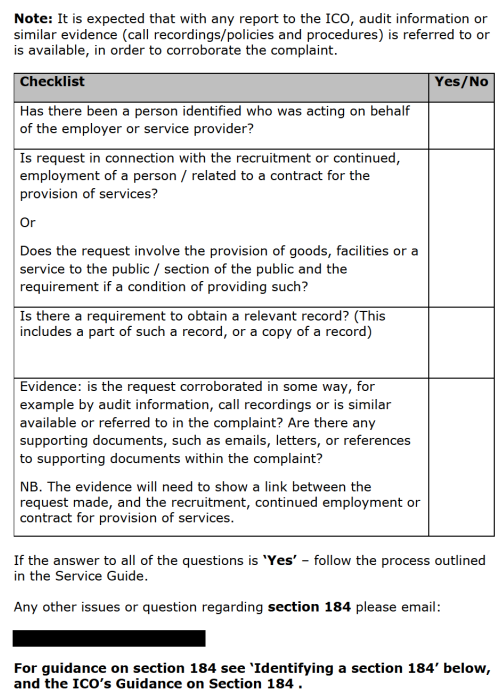 Under s.184 it is a criminal offence to make an enforced subject access request (‘SAR’) for a ‘relevant record’ in the recruitment of an employee, the continued employment of a person or a contract for the provision of services (e.g credit lenders and the consumer, a landlord and tenant and an insurance company and the insured).
