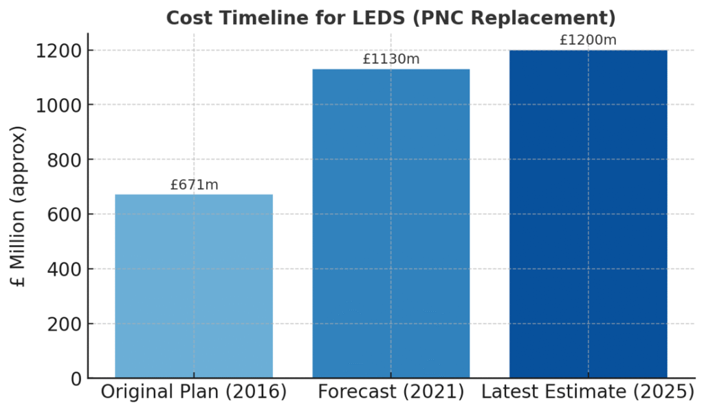2025 press/trackers: LEDS commonly cited as a £900m, 12-year programme to March 2026; some reporting warns total cost likely to top £1bn (consistent with NAO’s whole-life estimate). Amber confidence remains. (PublicTechnology)