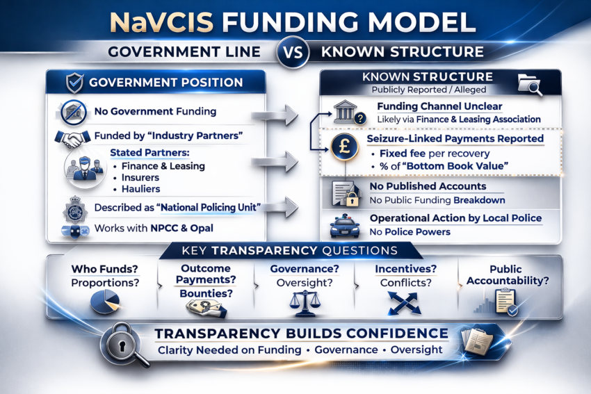 Where a body works alongside police forces, influences vehicle seizure activity, and participates in national intelligence discussions, clarity about its funding structure is essential for public confidence.