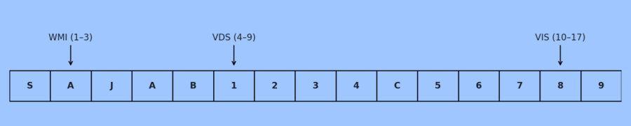 • WMI (World Manufacturer Identifier, 1–3)
